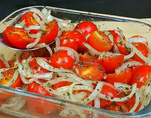Магазинные помидоры не такие вкусные, как дачные, но если сделать из них маринованную закуску — она всегда будет хитом на столе. Секрет вкуса здесь в смеси лука, лимонного сока, меда и чеснока, с перцем.