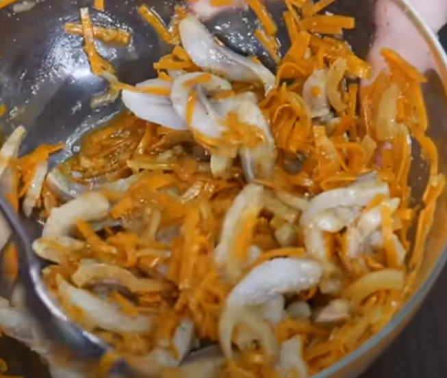На терке для корейской моркови пропускаем морковь в салатницу, сразу шинкуем к ней тонкими полукольцами лук. И теперь добавляем к овощам уксус, сахар, соевый соус, молотый кориандр, черный и красный молотый перец.