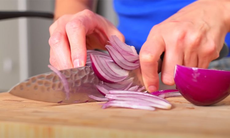 Отвариваем куриное филе и даем ему остыть. Тем временем тонко режем лук, добавляем к нему сахар и уксус. Перемешиваем и даем луку промариноваться 10 минут, чтобы он потерял свою горечь. Отварное и остывшее куриное филе делим вдоль волокон.