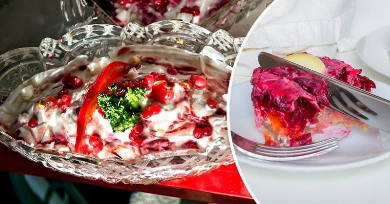Отожми сок у свеклы, а затем выкладывай ее на салатик. Затем снова смазывай майонезом. К свекле стоит добавить немного чернослива, но можно обойтись и без него. Посыпь салатик измельченными орехами.