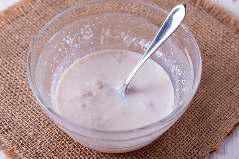 Смешай ингредиенты для дрожжевой опары (дрожжи + 1 ч. л. сахара и молоко). Накрой полотенцем и поставь на 15–20 минут в теплое место, чтобы дрожжи увеличились в объеме.