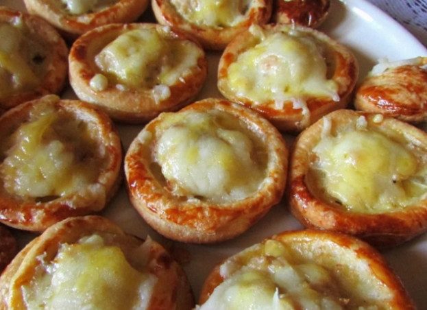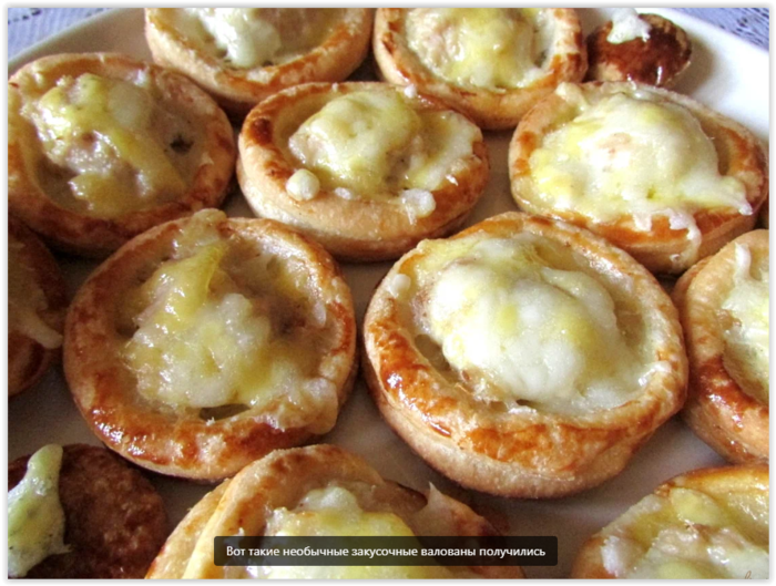 Выставила t 200° С. И там уже смотрела по времени и по «реакции» на t своих «сооружений». Зная, что мяско сырое и оно должно «подвергаться термической обработке» не менее 25 — 30 мин., регулировала t, чтобы и тесто не подгорело и от сырого мяса никто не пострадал! :) Минуты за 2 — 3 до готовности посыпала все «башенки» сыром. (Кстати, вырезанные серединки тоже испекла и тоже присыпала сыром — получились такие солёненькие «хрустики» похожие на чипсы! Вполне подойдут для любителей пива!