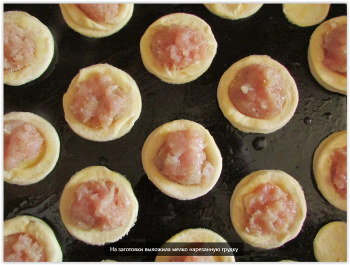 Порезала небольшими кубиками грудку, посолила и приправила грудку по вкусу (можно добавить любимые травки-приправки). Смазала оставшимся желтком поднявшиеся валованчики. Выложила в серединку по небольшому кусочку сливочного масла (мне показалось, что грудка будет слегка суховатой).
