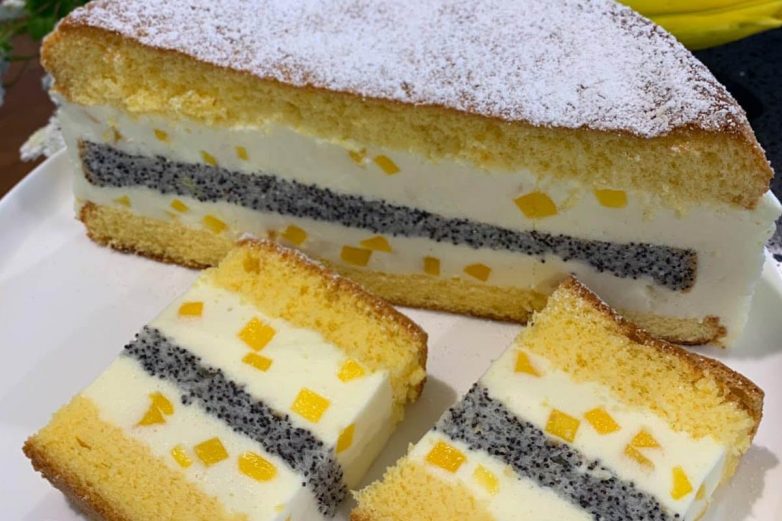 Теперь собираем торт. Лучше делать это в форме с высокими бортиками, потому что крем достаточно жидкий. Сначала обычный бисквит, сверху выложи половину крема. Дальше маковый корж, дальше вторая половина крема. Сверху накрываем второй половиной бисквита. Отправь торт в холодильник минимум на 8 часов. Перед подачей можно посыпать сахарной пудрой.