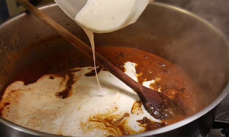 Приправляем солью и перцем, варим на медленном огне полчаса. Добавляем сливки и взбиваем блендером. Хлеб режем кубиками и обжариваем на оливковом масле до хрустящей корочки.