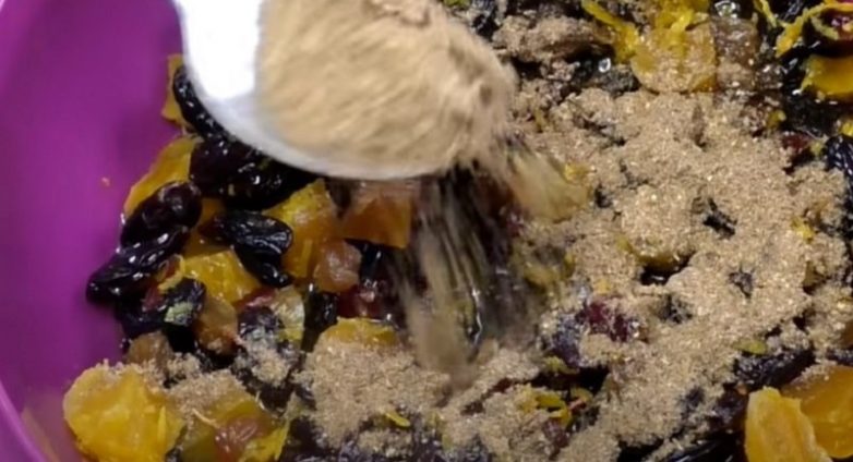 Для начала нужно подготовить сухофрукты. Замочи их в кипятке на 15 минут, сполосни холодной водой, высуши. Обрати внимание, что сухофрукты можно брать любые.