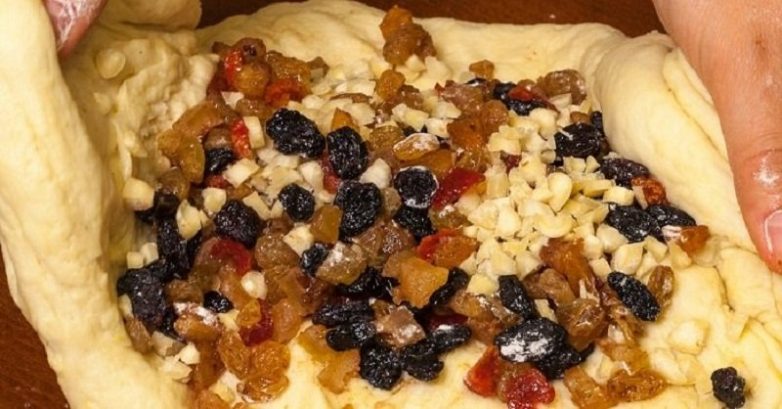 Слей с сухофруктов лишнюю жидкость. Вмешай их в тесто и слегка присыпь мукой. Накрой полотенцем и поставь в теплое место на полчаса.