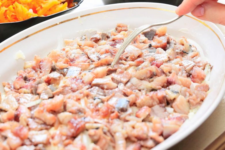 Итак, в самом низу у нас селедка. Ее нужно очистить и нарезать мелкими кубиками. Советую брать именно селедку, а не пресервы. Так в разы вкуснее.