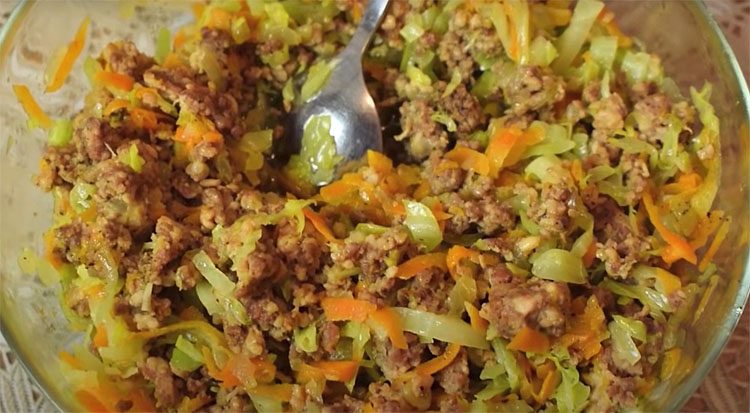 В отдельной миске подготавливается фарш — специй в него добавляется больше, чем в картофель.