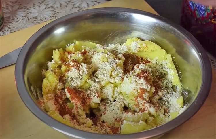 Первым делом чистим и варим картошку, разминаем в пюре и добавляем смесь перцев и другие специи.