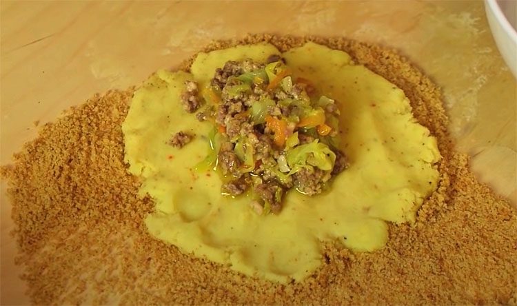 Теперь осталось сформировать зразы. Раскатываем лепешки из пюре прямо на панировочных сухарях. Начинку выкладываем в центр.