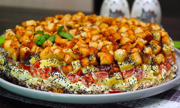 Сверху кладем яйца, помидоры, сыр — каждый слой мажем майонезом. Перед подачей сверху выкладываем сухарики и мак.
