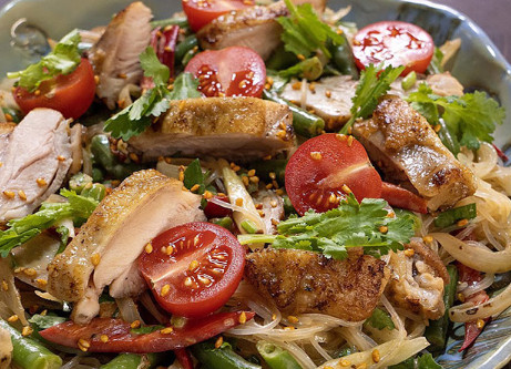 Перец режем соломкой. Перец и сельдерей смешиваем с соусами, добавляем обжаренный лук, фасоль, фунчозу, зелень. Курицу режем небольшими полосками, часть добавляем в салат, а часть оставляем для сервировки.