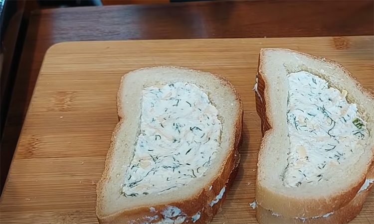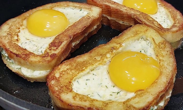 Теперь из одного кусочка хлеба вырезаем центр. Второй намазываем творожной массой. Накрываем первым кусочком и вымачиваем заготовку в белках. Перекладываем на сковороду. В центр заготовки выливаем по яйцу и поджариваем, пока оно не схватится.