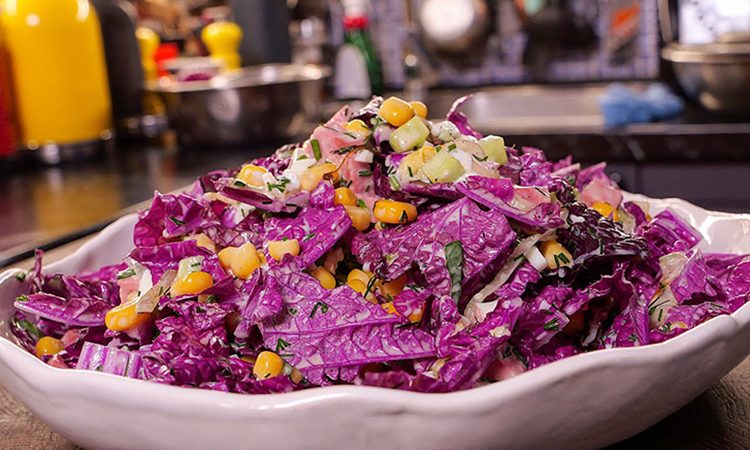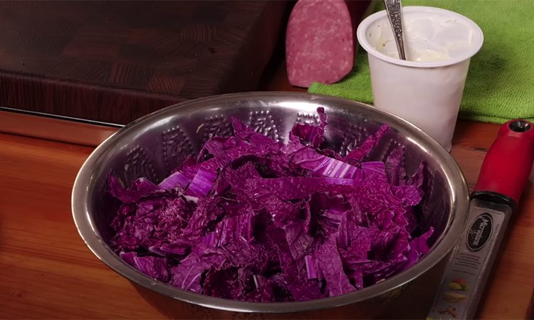 Новогодний салат из нежной верхней части листьев китайской капусты может легко стать украшением всего вечера. Саму капусту многие гости даже не узнают: хитрость вкуса этого необычного салата в особой заправке, смешанной на основе сметаны, горчицы и майонеза.