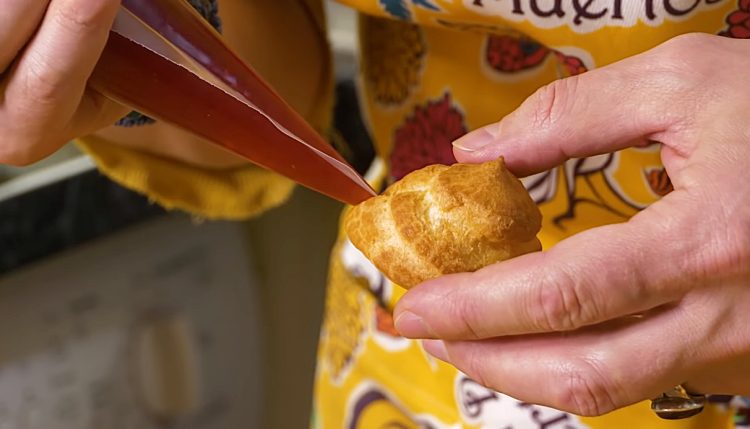 Даем готовому тесту немного остыть и через трещины по краям пирожных начиняем их по очереди из двух кондитерских мешков с начинкой, заполняя пустоту по центру.