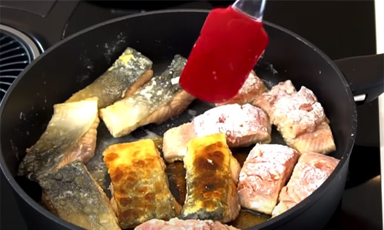 Рыбу режем крупно и перекладываем пока в отдельную миску. Солим ее и обваливаем в муке. Разогреваем в сковороде немного масла, обжариваем филе на большом огне.