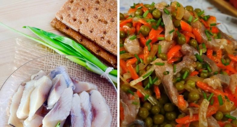 К селедке добавь консервированный горошек, морковку и лук. С последнего нужно заранее слить жидкость и слегка промять лук. Заправь салатик растительным маслом и слегка присоли его. Перемешай. Дай салату слегка настояться.