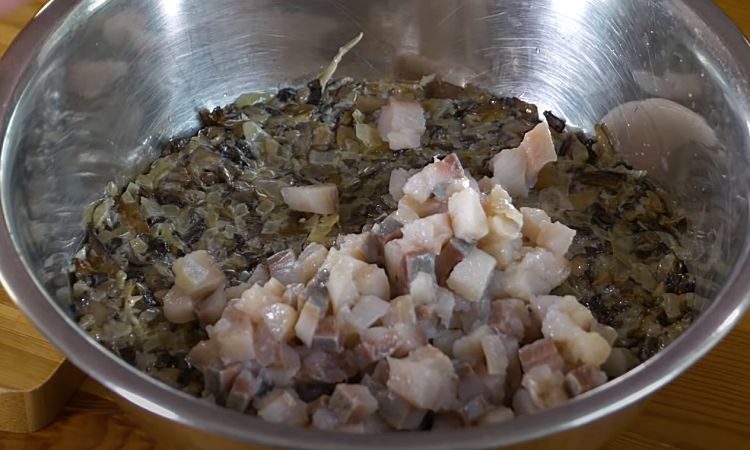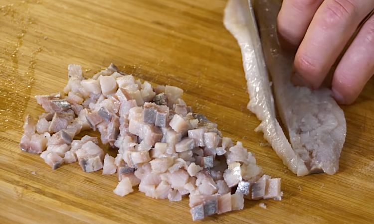 Нарезанную небольшими кубиками селедку выкладываем на смесь грибов с луком, так же утрамбовываем при помощи ложки или лопатки. Накрываем глубокую тарелку плоской (сервировочной) и переворачиваем.