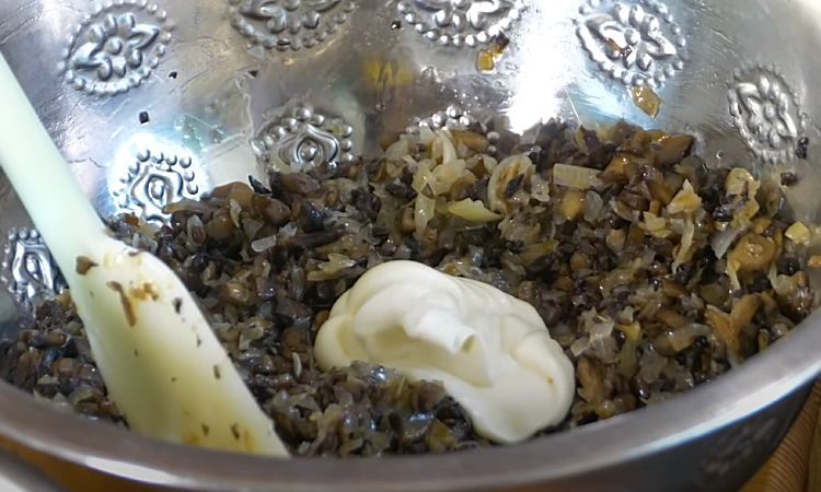 Остывшие грибы и лук перемешиваем вместе с майонезом в одной посуде, а затем перекладываем в чистую глубокую тарелку, разравнивая и уплотняя.