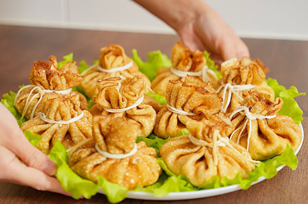 Выкладываем начинку, формируем мешочек. Фиксируем его полоской сыра сулугуни.