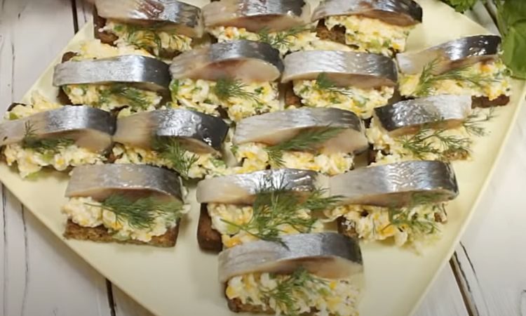 На готовые тосты намазываем смесь, после чего кладем кусочек селедки. 5 минут и тарелка закуски готова: для свежести ее сверху можно сбрызнуть соком лимона.