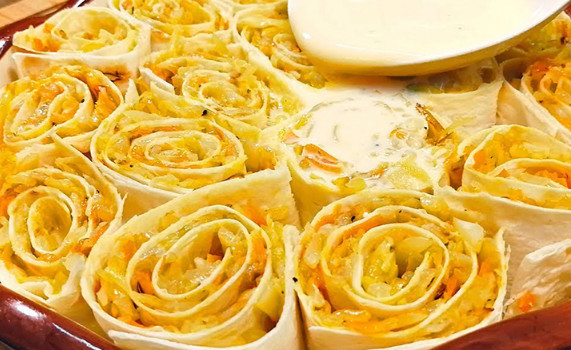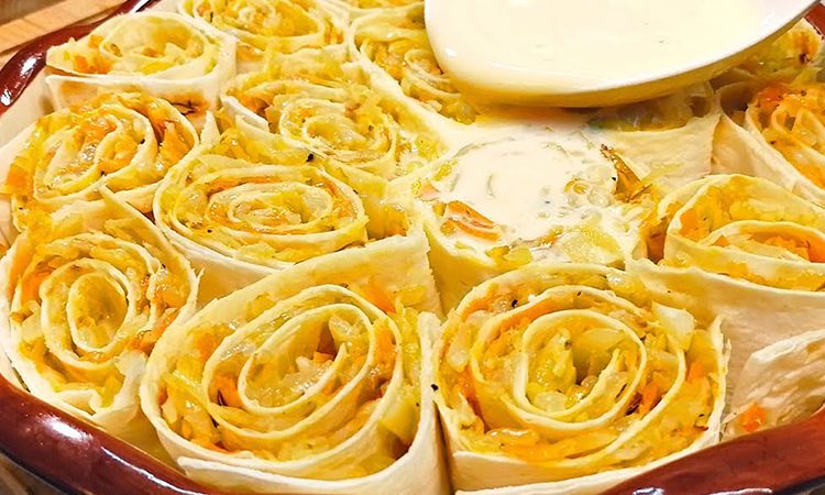 Измельченные лук и морковь пассируем в сковороде до мягкости. Затем шинкуем к ним капусту, добавляем томатную пасту. Перекладываем овощи на лаваш и заворачиваем его рулетом. В отдельной миске смешиваем яйца, молоко, соль и перец для заливки. Выливаем смесь к рулету, ставим на 35 минут в духовку при 180 градусах.