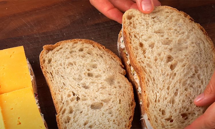 Лук и огурцы режем мелкими кубиками. Укроп можно добавить по желанию — его тоже режем. Сливаем воду из тунца и добавляем его в миску к овощам. Добавляем майонез, горчицу и лимонный сок. Приправляем солью и перцем. На два ломтика хлеба выкладываем половинку намазки, сверху кладем чеддер и закрываем хлебом.
