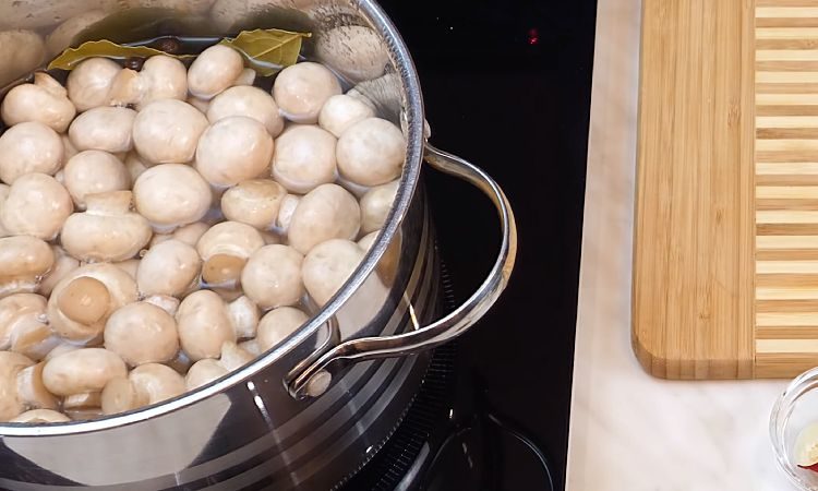 Возьмем для основы 600 граммов шампиньонов. Сначала быстро отварим их. Ставим кастрюлю с литром воды и добавим: 40 граммов соли, 1/2 чайной ложки сухой лимонной кислоты, пару лавровых листиков, 5 горошин черного перца. Доводим до кипения, перекладываем сюда шампиньоны и варим 10 минут на небольшом огне под крышкой.