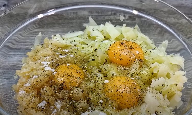 В отдельной миске смешиваем капусту и обжаренный лук. Вбиваем к ним яйца и муку, солим, перчим, добавляем сухие травы и чеснок. Перемешиваем и теперь нам осталось только обжарить заготовки на большом огне. Для этого блюда можно также сделать несложный домашний соус. Смешиваем йогурт с солью, лимонным соком, сушеной петрушкой и измельченным чесноком. Так будет еще вкуснее.