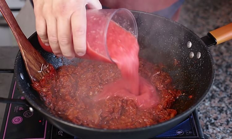 К луку всыпаем паприку и аджику, после чего вливаем в сковороду измельчённые блендером помидоры. После их закипания добавляем чайную ложку соли и размешиваем.