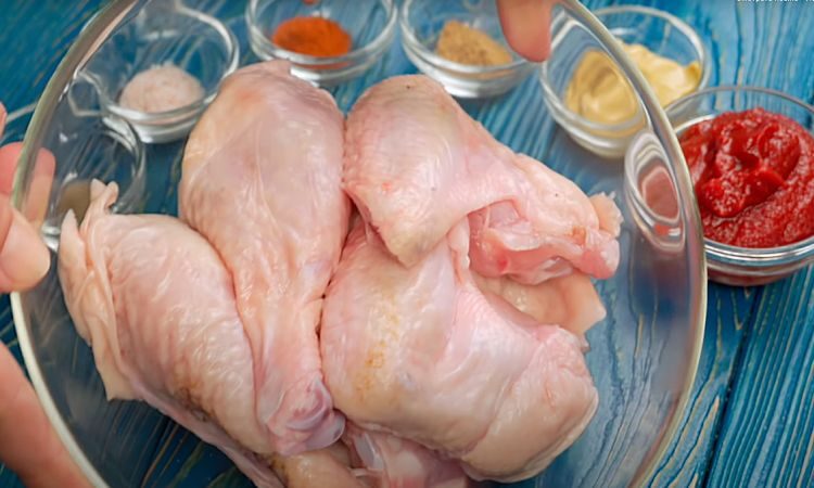 Голени, бедра и крылья, оставшиеся после разделки одной куриной тушки, смешиваем с солью, перцем, кориандром, горчицей, томатной пастой, паприкой, водой и пропущенным через пресс чесноком. Даем промариноваться в течение 20 минут.