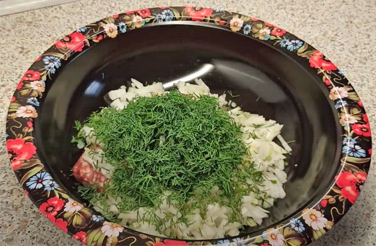 600 граммов фарша смешиваем с мелко нарезанным луком, укропом, солью и зирой. Добавляем немного воды, чтобы фарш был липким.