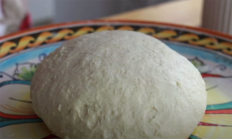 Затем перенесите на рабочую поверхность, раскатайте и сформируйте руками в форму круга, как на фото ниже. Переложите тесто на противень.