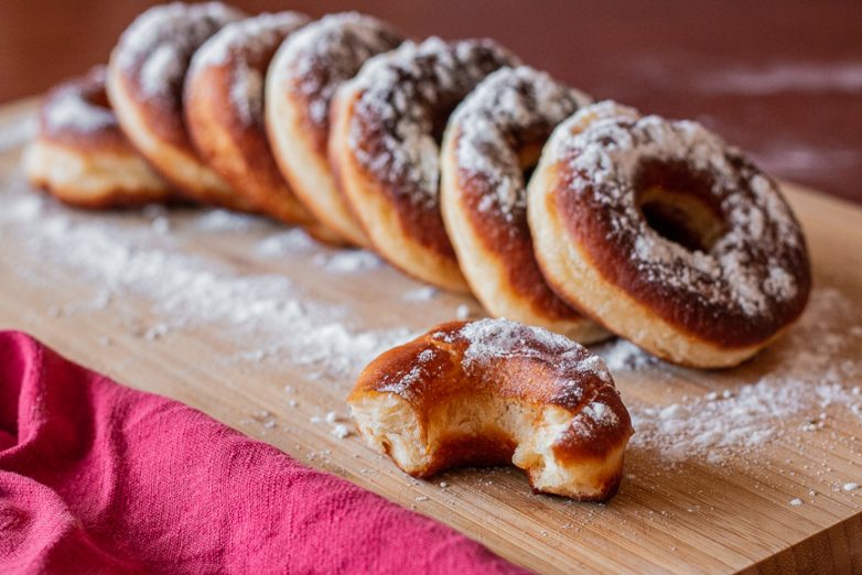 Пончики получились пышные, вкусные и ароматные. Из этого количества теста выходит 8–10 штук. Есть пончики лучше сразу, пока они горячие. Мне нравится подавать их с сахарной пудрой, но можно покрыть кондитерской глазурью.