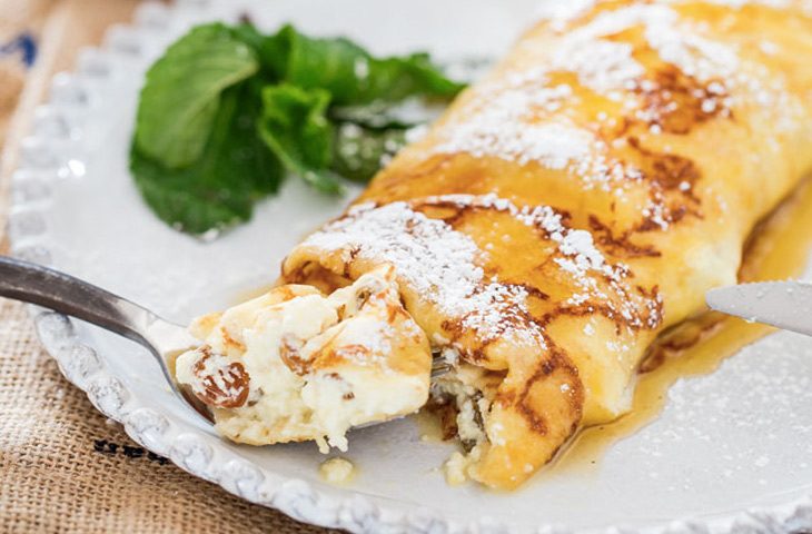 Разогреть духовку до 190 градусов. Слегка смазать маслом форму для выпечки. В миске среднего размера смешать сыр, сахар, яйцо и изюм. Выложить на каждый блинчик 1/5 часть начинки, примерно 3 столовые ложки, а затем свернуть конвертом. Положить блинчики в форму и выпекать в течение 10 минут. Перед подачей по желанию посыпать сахарной пудрой и полить кленовым сиропом.