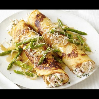 Выложить блинчики на тарелки, сверху дополнить соусом со спаржей и посыпать пармезаном.