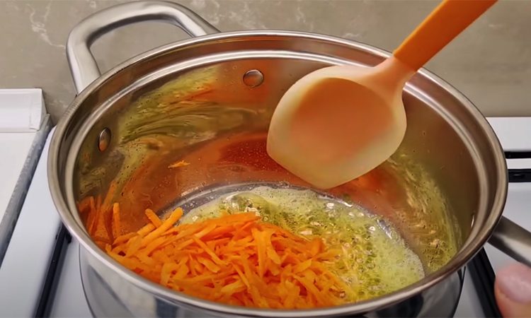 Затем снимаем кастрюлю с плиты и курицу убираем на отдельную тарелку и снимаем мясо с костей. Бульон процеживаем в чистую миску. В новой кастрюле разогреваем оливковое и сливочное масло. Натираем в нее на крупной терке еще одну морковь. Следом полукольцами шинкуем лук и обжариваем овощи до золотистости. Пропускаем к ним через пресс чеснок и перемешиваем.