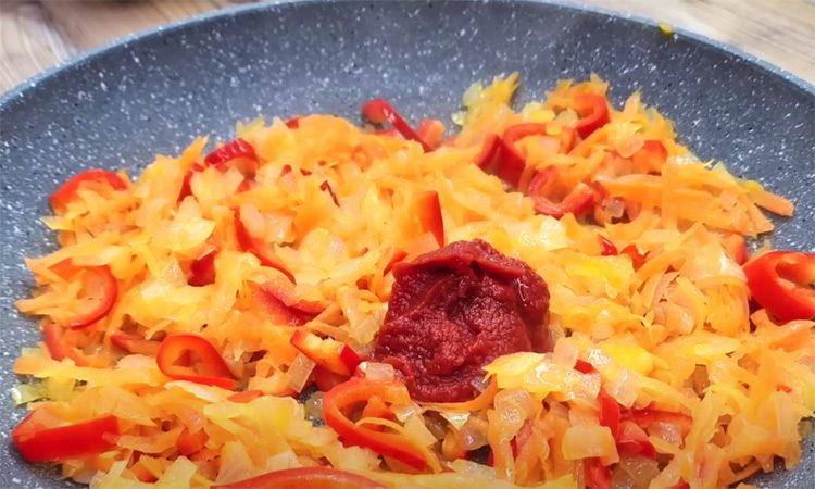 Капусту мелко шинкуем или натираем на крупной терке, слегка солим и убираем в сторону. Лук режем кубиками, морковь трем на терке, перец режем соломкой. Обжариваем эти овощи на растительном масле. Добавляем в сковороду ложку томатной пасты и молотого перца, перемешиваем и обжариваем еще немного.