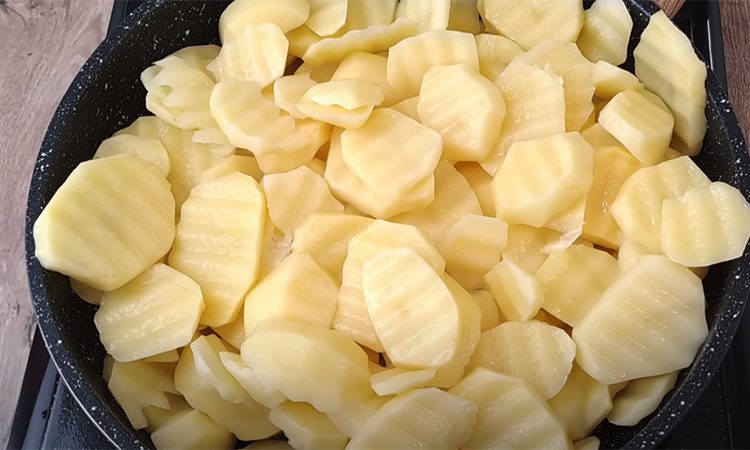 Картофель чистим, моем и режем слайсами, затем солим и перчим. Жарим на сковороде до полуготовности, чтобы добавить вкуса. В отдельной посуде взбиваем яйца с солью и перцем. Добавляем сушеный чеснок, куркуму и все хорошо взбиваем.