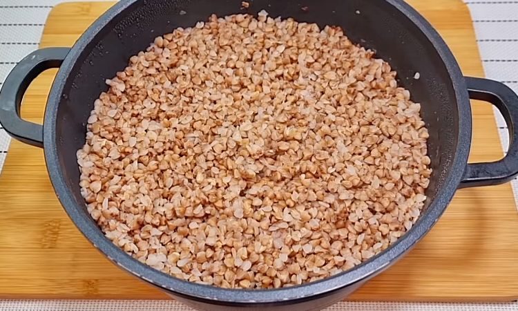 Промытую гречку заливаем водой и варим на среднем огне до готовности, после чего даём остыть.