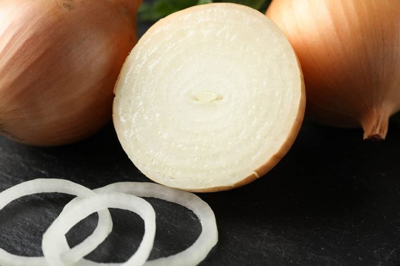 Мы будем тушить куриные шейки. Для начала нарежь лук. Но не очень мелко, можно даже полукольцами.