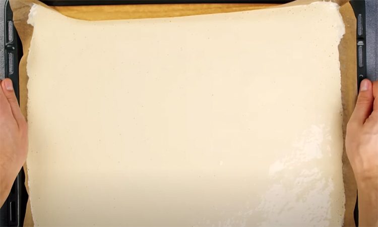 Чуть подмороженный плавленный сыр натираем на мелкой терке в глубокую миску. Разбиваем к нему яйца, добавляем сметану, муку и соевый соус. Перемешиваем, затем застилаем пергаментной бумагой противень. Выливаем на него сырную заготовку и разравниваем в один слой. Ставим на 15 минут в духовку при 200 градусах.
