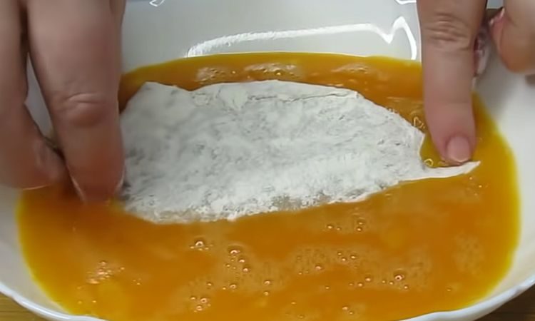Чебуреки поочередно опускаем в емкость со смесью муки и крахмала, затем в тарелку со взбитыми с солью яйцами и в панировочные сухари.