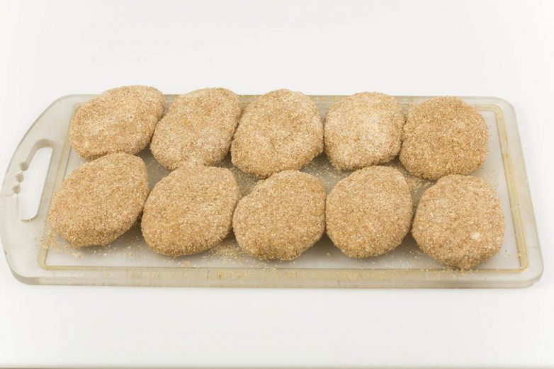 Далее сформируй котлеты и обваляй каждую в панировочных сухарях. Обжаривай котлеты на смеси растительного и сливочного масла на хорошо разогретой сковороде по 3–4 минуты с каждой стороны. Крышкой накрывать не нужно.
