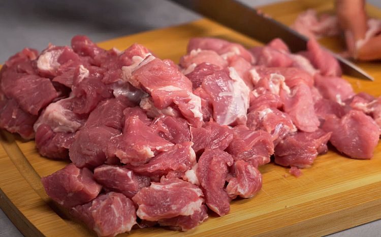 Добавляем нарезанную средними кусками свиную шейку, перемешваем и жарим ещё столько же.