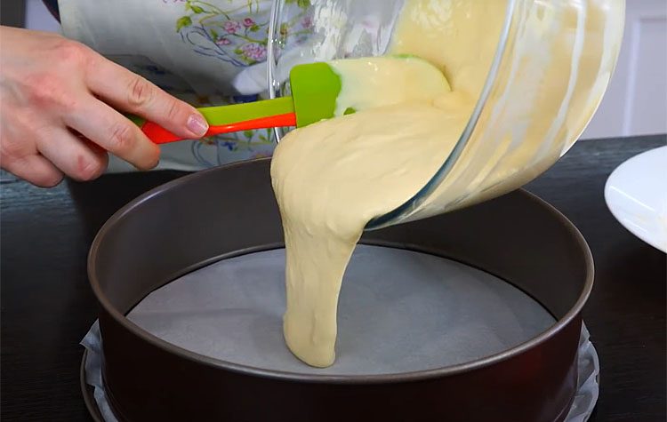 Берем форму для выпечки, укладываем на дно пергамент и заливаем тонкий слой теста.