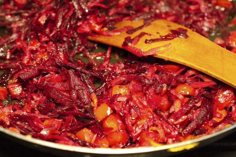 Тертую свеклу пассеруем в сковороде на растительном масле, добавив ложку уксуса, чтобы максимально сохранить бордовый цвет. Можно использовать яблочный уксус, потому что он не так вреден для здоровья.