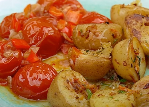 Этот картофель делается с луком и морковью, с отдельной порцией обжаренных помидоров черри. Поверьте, теперь картофель приготовленный таким образом будут просить каждый день, а про обычную картошку забудут.