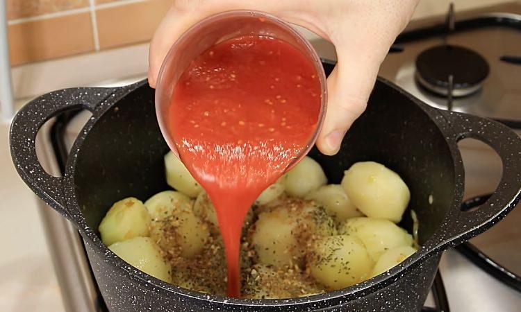 Добавьте в казан по 1 чайной ложке базилика, сухого чеснока и 1/2 чайной ложки молотого кориандра. Влейте в казан 1 стакан перетертых томатов. Добавьте соль и сахар по вкусу. Весь картофель должен быть погружен в томатный соус.